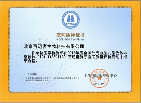 2015年12月 14日,百邁客醫(yī)學收到衛(wèi)生部臨床檢驗中心發(fā)來的室間質(zhì)評證書,證書顯示百邁客醫(yī)學參加的“外周血胎兒染色體非整倍體(T21、T18、T13)高通量測 序室間質(zhì)量評價活動中成績合格”,順利通過2015年度室間質(zhì)評。表明百邁客在2015年11月的該項目室間質(zhì)評再次獲得滿分,此前,在2015年5月的 室間質(zhì)評中,該項目亦滿分通過。