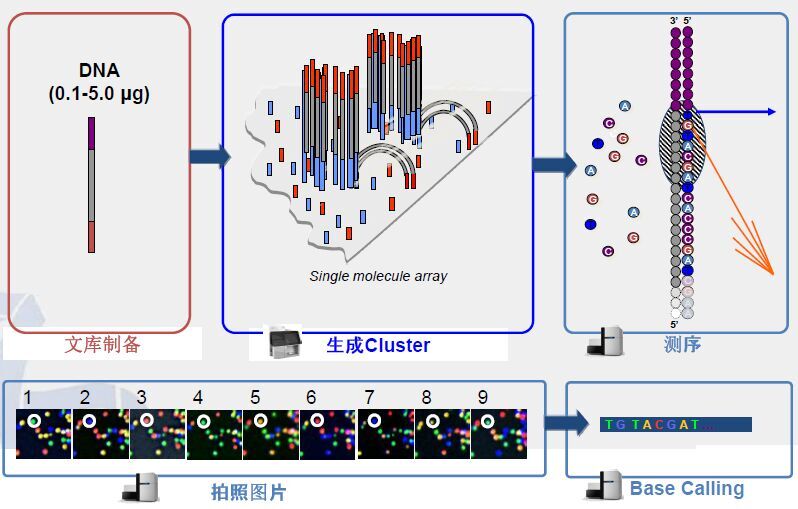 現(xiàn)在市場上占優(yōu)勢的高通量測序方法是Solexa法。它是一種基于邊合成邊測序技術(shù)(Sequencing-By-Synthesis,SBS)的新型測 序方法。通過利用單分子陣列實現(xiàn)在小型芯片(FlowCell)上進行橋式PCR反應(yīng)。由于新的可逆阻斷技術(shù)可以實現(xiàn)每次只合成一個堿基,并標記熒光基 團,再利用相應(yīng)的激光激發(fā)熒光基團,捕獲激發(fā)光,從而讀取堿基信息。
