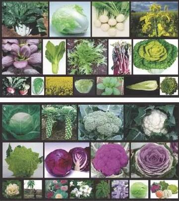 蕓薹屬包括三個二倍體物種:蕓薹(Brassica rapa)、黑芥(B. nigra)和甘藍(B. oleracea),這三個基本種經(jīng)過兩兩雜交又產(chǎn)生了四倍體的歐洲油菜(B. napus)、非洲油菜(B. carinata)和芥菜(B. juncea),這就是“禹氏三角”。隨著人工馴化和持續(xù)的育種工作,這些物種產(chǎn)生了高度多樣化的形態(tài)型,例如結(jié)成球狀的葉片、膨大的塊莖(或根 部、頂芽、腋芽等)。有意思的是,某些物種的形態(tài)型,盡管是在不同的地區(qū)獨立培育而成,但卻表現(xiàn)出相似的表型特征,這便是趨同馴化的結(jié)果。