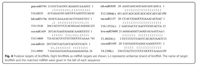 利用psRNATarget軟件及miRbase數(shù)據(jù)庫(kù)信息從DE-lincRNA中篩選miRNA的靶標(biāo),找到101個(gè)靶標(biāo)lincRNA。其中有6個(gè)miRNA被本實(shí)驗(yàn)室先前的small RNAseq 驗(yàn)證過(guò),并且這6個(gè)miRNA是跟小麥白粉病相關(guān)的。