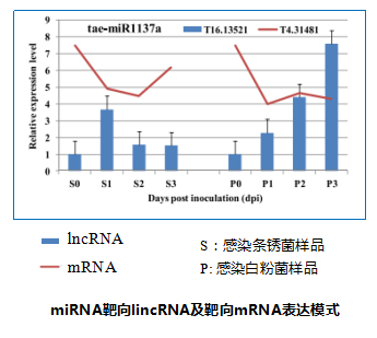 對(duì)miRNA的靶標(biāo)lincRNA和靶標(biāo)mRNA的調(diào)控作用關(guān)系進(jìn)行驗(yàn)證,發(fā)現(xiàn)經(jīng)Pst 或Bgt侵染后共同表達(dá)的lincRNA及共同表達(dá)的mRNA大都表現(xiàn)出了相反的表達(dá)模式。表明,小麥中l(wèi)inRNA可能通過(guò)與miRNA作用間接影響mRNA的表達(dá)。