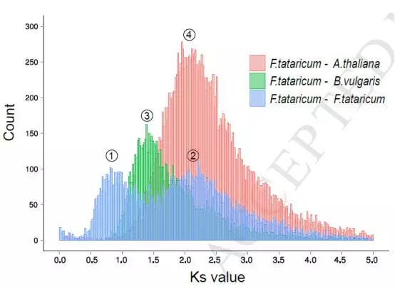 通過苦蕎與擬南芥、苦蕎與甜菜進行分析,通過Ks計算發(fā)現(xiàn)苦蕎經(jīng)歷了全基因組復(fù)制事件,近期是在下圖0.84-0.92之間,而更古老的一次復(fù)制發(fā)現(xiàn)在64.42~70.77 Mya。而全基因組復(fù)制事件的發(fā)生,也導(dǎo)致了很多與抗逆相關(guān)基因家族的擴張或者保留。這也與后期苦蕎的抗逆性有一定關(guān)系。