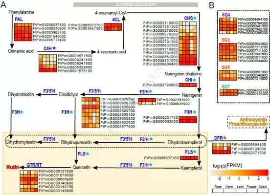 蘆丁的生物合成具有特殊的意義,而苦蕎被認(rèn)為是這種有益的類黃酮的主要食物來源??喔墒w麥營養(yǎng)生物質(zhì)中含有3%的蘆丁。通過比較基因組以及不同生長部位的轉(zhuǎn)錄組測序,發(fā)現(xiàn)原來所不知道的全長蛋白CHI(FtPinG0002790600)和f3h(FtPinG0006662600)。