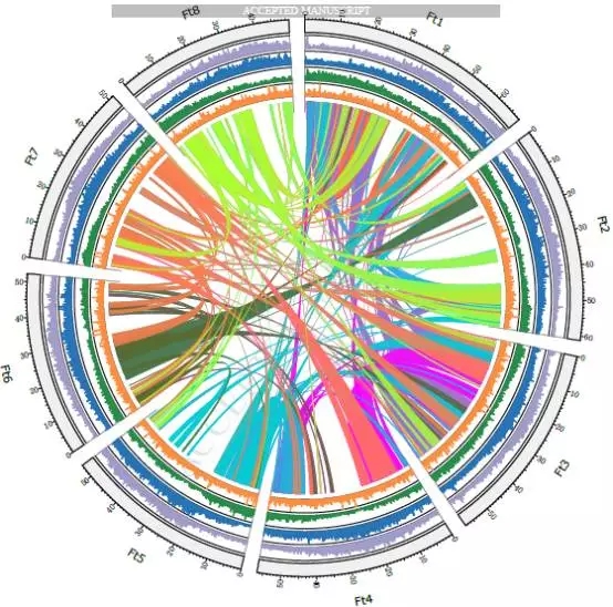 苦蕎通過K-mer預(yù)估基因組大小約為489Mb,流式細(xì)胞儀預(yù)估為540Mb。共組裝出來489.3Mb的基因組序列,共8778個Contigs,Contig N50=550.7kb。通過Hi-C數(shù)據(jù)將436.4Mb的序列錨定到8條染色體上(定位比例為89.18%)。然后再通過光學(xué)圖譜數(shù)據(jù)進行校正。三代數(shù)據(jù)的準(zhǔn)確性通過二代評估為99.96%,并且在基因區(qū)具有更少的錯誤存在。