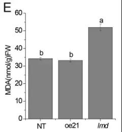 類病變突變體通常會(huì)表現(xiàn)出自發(fā)性的細(xì)胞程序性死亡(PCD),作者通過(guò)伊文思藍(lán)染色比較了lmd與NT、oe21的細(xì)胞死亡情況(圖4);丙二醛含量檢測(cè)間接反映了lmd細(xì)胞損壞程度也更高(圖5);