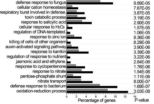 為了深入了解lmd體內(nèi)的分子水平變化,作者進(jìn)行了轉(zhuǎn)錄組測(cè)序。對(duì)差異基因進(jìn)行分析發(fā)現(xiàn)了許多與致病相關(guān)的基因,如WRKY、谷胱甘肽-轉(zhuǎn)移酶(GST)、乙烯反應(yīng)因子(ERF)和絲氨酸/蘇氨酸蛋白激酶(serine/threonine-protein kinase),這些都已經(jīng)被研究證實(shí)與防御反應(yīng)相關(guān)。GO富集分析顯示,參與催化活性、抗氧化活性、免疫系統(tǒng)過(guò)程和刺激響應(yīng)的差異基因發(fā)生了顯著富集(圖9)。