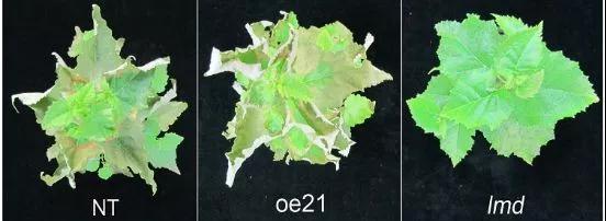 轉(zhuǎn)錄組材料為lmd、oe21、NT,lmd突變體是從BpGH3.5轉(zhuǎn)基因株系中分離出;oe21株系是正常的BpGH3.5轉(zhuǎn)基因株系;對(duì)照材料是非轉(zhuǎn)基因的NT。