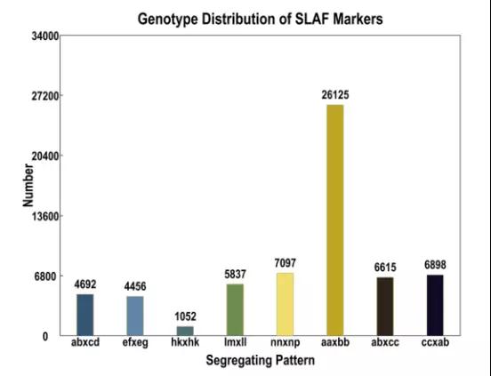 生物信息學(xué)分析,父本產(chǎn)生249076個SLAF標(biāo)簽,母本產(chǎn)生279416個SLAF標(biāo)簽,平均深度分別為32.62×和20.53×。對于F1作圖群體,每個個體平均產(chǎn)生190361個SLAF標(biāo)簽,平均深度為8.80×。其中62772個多態(tài)性SLAF標(biāo)簽用于基因分型(圖1)。除aa×bb類36647個SLAF標(biāo)記被用于圖譜構(gòu)建,適合F1群體的后期連鎖圖譜構(gòu)建,有效多態(tài)性率為7.99%。