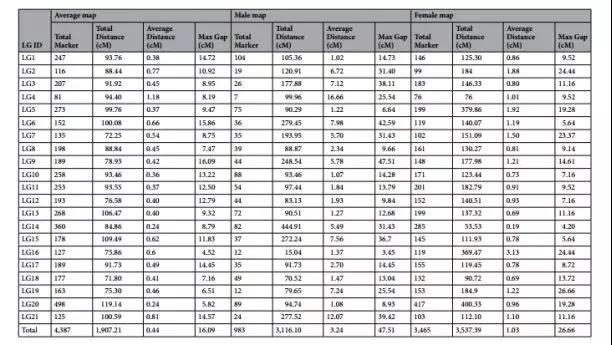 經(jīng)過濾,得到可用于作圖的 SLAF 標(biāo)簽 4678 個,通過兩兩標(biāo)簽間計算重組率和 MLOD 值,根據(jù) MLOD 值將標(biāo)簽分為 21 個連鎖群,最終確定上圖標(biāo)記共 4387 個,雄性圖譜全長3116.10 cM,共983個標(biāo)記,平均圖距3.24 cM。雌性圖譜全長3537.39cM,共3465個標(biāo)記,平均圖距為1.03cM。整合圖譜全長1907.21 cM,平均圖距為0.44 cM(圖2)。上圖率為 93.78%,上圖標(biāo)簽偏分離比例 2.52%。