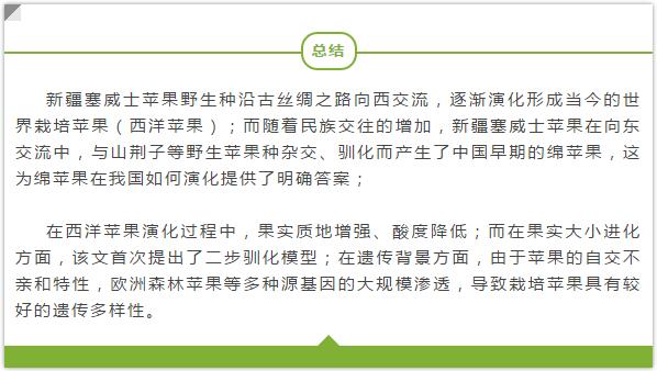 研究發(fā)現(xiàn),從新疆境內(nèi)采集的塞威士蘋(píng)果保持較高的同源性、最原始,而同屬中亞地區(qū)的哈薩克斯坦境內(nèi)的塞威士蘋(píng)果基因雜合度則相對(duì)較高。這充分說(shuō)明,世界栽培蘋(píng)果起源于中國(guó)新疆。該研究確認(rèn)全世界 蘋(píng)果的共同祖先是新疆野蘋(píng)果,歐洲的森林蘋(píng)果作為重要的基因貢獻(xiàn)者與現(xiàn)代蘋(píng)果之間存在大規(guī)?;驖B透。