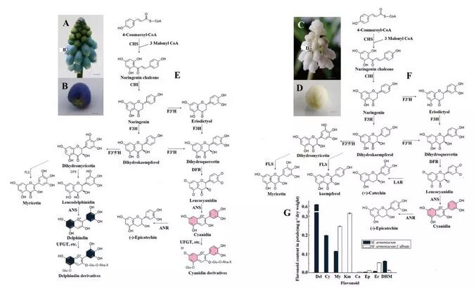 采用HPLC分別對(duì)藍(lán)色和白色風(fēng)信子中花青色素定量分析,結(jié)果顯示藍(lán)色風(fēng)信子中含有飛燕草素(Del)和花青素(Cy)兩種花青色素,白色風(fēng)信子中沒有檢測(cè)到花青色素或其衍生物。 進(jìn)一步研究表明,白色風(fēng)信子中楊梅黃酮(myricetin )和兒茶素(catechin )的存在,表明花青素合成通路(ABP)下游作用的基因發(fā)生改變,如dihydroflavonol 4-reductase (DFR),anthocyanidin synthase (ANS),或anthocyanidin 3-O-glucosyltransferase(UFGT),導(dǎo)致花青素合成通路受阻。