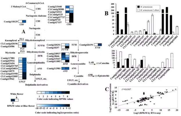 通過將藍(lán)色和白色風(fēng)信子花青素顏色代謝相關(guān)關(guān)鍵基因比較分析,顯示出了與一般研究相反的結(jié)果,即在白色風(fēng)信子花中,大部分花青素合成相關(guān)的uni-transcripts表達(dá)豐度高于在藍(lán)色花中的表達(dá)。進(jìn)一步研究發(fā)現(xiàn),在白色花瓣提取物中檢測(cè)到大量的類黃酮化合物,其中許多與花青素共享相同的中間體或酶。這可能是花青素含量與葡萄風(fēng)信子花色苷生物合成基因表達(dá)量不相關(guān)的主要原因。最后,選擇花色相關(guān)基因qRT-PCR驗(yàn)證,驗(yàn)證測(cè)序結(jié)果的準(zhǔn)確性。