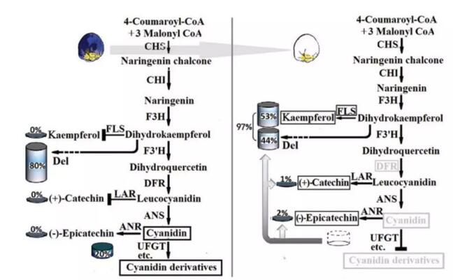 白色風(fēng)信子花瓣中兒茶素(catechin )和表兒茶素(epicatechin )的存在,表明紅色Cy一定存在于白色花中,即使只是很短的時(shí)間或很少的量,暗示著Cy色素丟失的復(fù)雜代謝機(jī)制。Cy合成上游反應(yīng)中的通路的受阻以及下游反應(yīng)中的多重分支變化過程,最終導(dǎo)致白花紅色色素的消失。