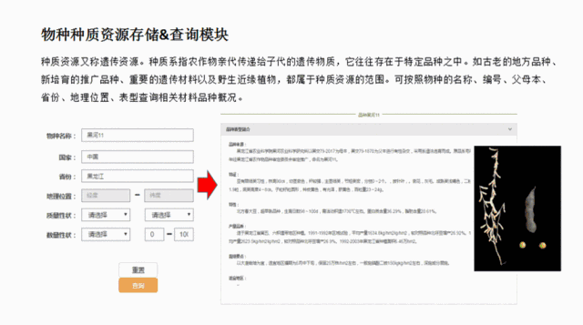 存儲&查詢模塊:設置了種質(zhì)資源、突變體信息、性狀座位信息、分子標記、基因功能信息、基因組數(shù)據(jù)、轉錄組數(shù)據(jù)的存儲和查詢。