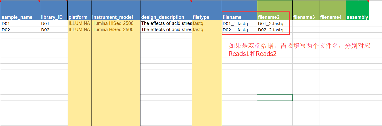 第六步:樣本具體信息,需要我們下載表格填寫,表格中綠色的為必填,藍(lán)色的需要至少填一個,其它內(nèi)容可以選填或者不填寫,如果是生物學(xué)重復(fù)需要添加一列replicate,填寫完成后需要將信息粘貼到文本文件中(TXT格式),然后上傳到網(wǎng)站上;