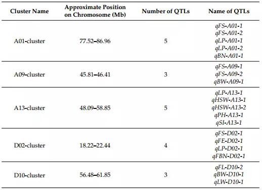 作者以10 Mb(?20 cM)物理區(qū)域包含兩個(gè)或多個(gè)QTL定為QTL簇標(biāo)準(zhǔn)。在5條染色體上檢測(cè)到5個(gè)QTL簇,每個(gè)簇至少有3個(gè)QTL(表1)。其中3個(gè)位于A基因組,2個(gè)位于D基因組中。鑒定出含有影響纖維品質(zhì)和產(chǎn)量性狀的多個(gè)QTL的基因組區(qū)域,有利于后期分子改良。