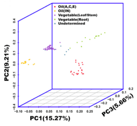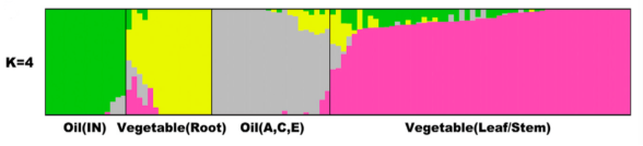 利用主成分分析來評估遺傳變異,分析結果顯示主要分為4個群:Vegetable(Leaf/Stem),Vegetable (Root),Oil (IN)和Oil (A,C,E),該結果與系統(tǒng)發(fā)育樹結果一致。