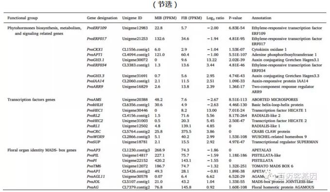植物調(diào)控網(wǎng)絡(luò)中,轉(zhuǎn)錄因子有著舉足輕重的地位。結(jié)合轉(zhuǎn)錄因子預(yù)測(cè)和差異基因分析,發(fā)現(xiàn)了一批可能調(diào)控性別發(fā)育的轉(zhuǎn)錄因子。比如編碼PvoAMS和PvobHLH的基因分別下調(diào)了5.4和5.2倍,編碼PvoWOX9和PvoSUP 的基因在FIB中上調(diào)。由此可見(jiàn),生長(zhǎng)素、細(xì)胞分裂素、生長(zhǎng)素能夠促進(jìn)花的性別分化為雌性,激素之間的相互作用和內(nèi)部穩(wěn)態(tài)平衡對(duì)花性別分化至關(guān)重要。