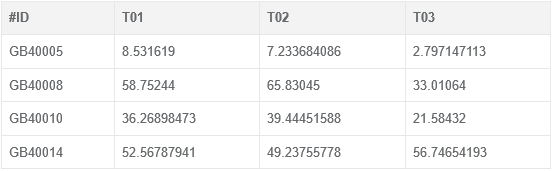 默認(rèn)首行、首列為表頭,一般每列表示一個樣品,每行表示一個基因,也可統(tǒng)計其他含義的數(shù)據(jù)矩陣。除表頭外,參與統(tǒng)計繪圖的內(nèi)容應(yīng)為純數(shù)字,文件范例如下: