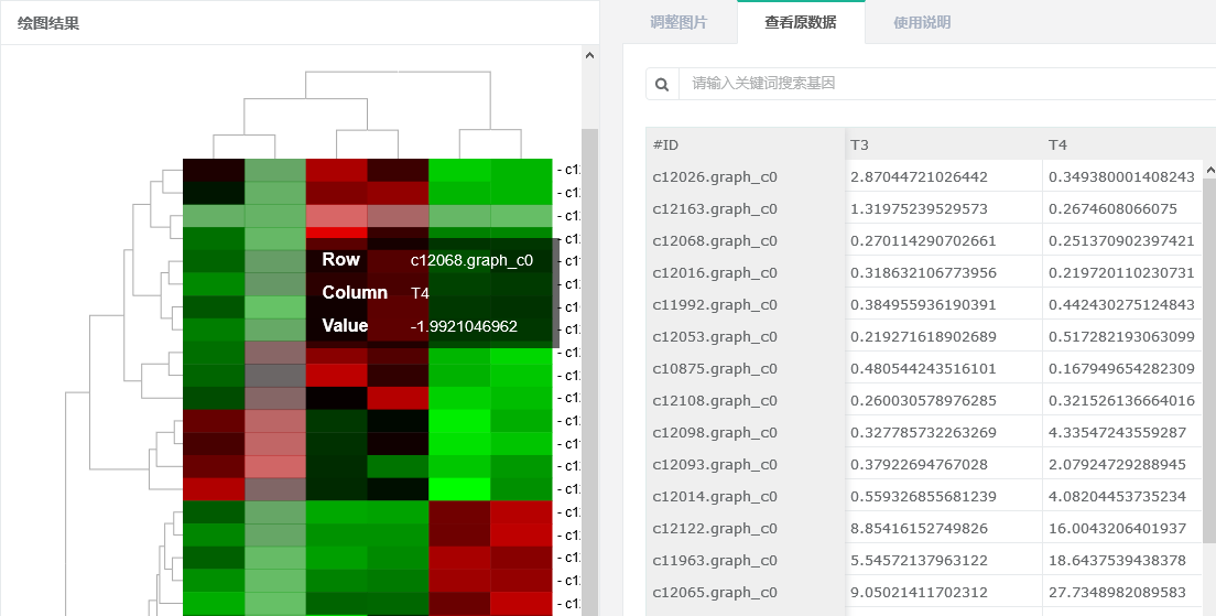 c 選中行聚類樹某分枝后,可在“查看原數(shù)據(jù)”也篩選出對應(yīng)行并下載。