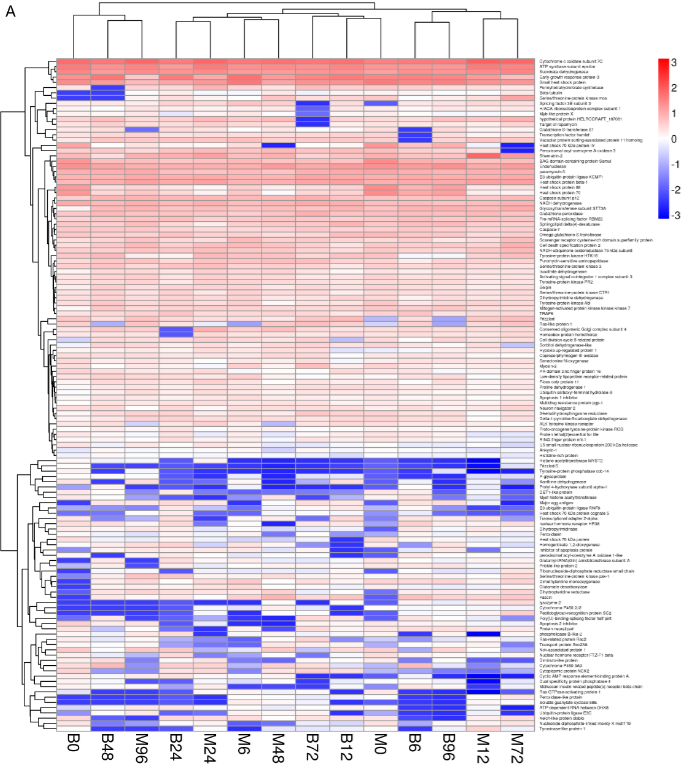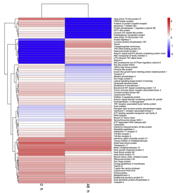 2017年,中國水產(chǎn)科學(xué)院喻達(dá)輝老師在百邁客云平臺上對合浦珠母貝免疫相關(guān)數(shù)據(jù)進(jìn)行分析,2篇文章(合浦珠母貝)先后分別發(fā)表于同一個雜志《Fish & Shell?sh Immunology》,這兩篇文章中都進(jìn)行了聚類熱圖分析。第一篇文章中研究人員將免疫相關(guān)差異表達(dá)基因按照不同時期進(jìn)行分層聚類分析,第二篇文章中研究人員將不同時期的unigene進(jìn)行了聚類熱圖分析,為后續(xù)研究結(jié)果的呈現(xiàn)做了較好的鋪墊作用。
