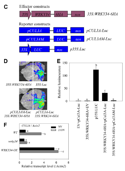 比如上面談到的Plant Cell的文章,作者發(fā)現(xiàn)轉(zhuǎn)錄因子WRKY34的轉(zhuǎn)錄迅速被冷應(yīng)激誘導(dǎo),之后構(gòu)建pCUL3A-LUC載體和W-box區(qū)域突變pCUL3A-LUC載體,與WRKY34共注射入煙草和擬南芥葉原生質(zhì)體,來驗證WRKY34以預(yù)測的W-box與CUL3A啟動子結(jié)合以增加其CUL3A轉(zhuǎn)錄,而CUL3A又介導(dǎo)FRI降解調(diào)節(jié)擬南芥春化過程中的開花,從而把生物學(xué)故事由冷誘導(dǎo)—WRKY34轉(zhuǎn)錄—CUL3A轉(zhuǎn)錄—FRI降解—擬南芥春化過程中的開花這樣一條線串起來。