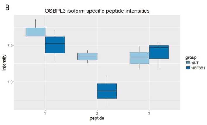 約65%的顯著差異表達(dá)的splice-specific-peptides在RNA水平上表現(xiàn)出一致的表達(dá)差異。例如,下調(diào)SF3B1的實(shí)驗(yàn)組中,OSBPL3 9號(hào)外顯子中分別有3個(gè)支持外顯子保留和1個(gè)支持外顯子去除的peptides被鑒定出來(lái)。兩種inclusion specific-peptides表達(dá)明顯較低,而exclusion specific -peptides則與對(duì)照相比表現(xiàn)出較高的表達(dá)量(如圖5所示)。