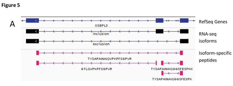 蛋白質(zhì)水平上發(fā)現(xiàn)的一些非典型的isoform翻譯成的蛋白質(zhì)可能在與常規(guī)類型的蛋白的功能不同。比如,Rac1b,相比于常見(jiàn)的RAC1蛋白能夠增強(qiáng)細(xì)胞存活能力。在不同的組織中,OSBPL3的isoform在RNA水平上表現(xiàn)出不同的表達(dá),表明它們可能具有不同的功能。 基于RNA-seq數(shù)據(jù)檢測(cè)到的少量的蛋白isoform揭示了目前蛋白質(zhì)組學(xué)的研究難點(diǎn)。mRNA 水平上發(fā)現(xiàn)的isoform在蛋白質(zhì)水平上沒(méi)有識(shí)別出來(lái)可能有很多原因,包括生物和技術(shù)層面。首先,并非所有的異常的isoform都被翻譯成蛋白質(zhì)。另外,轉(zhuǎn)錄和翻譯的動(dòng)力學(xué)相關(guān),特別是關(guān)于siRNA介導(dǎo)的下調(diào)制。同時(shí),isoform個(gè)數(shù)少也可能是剪接區(qū)域的翻譯后修飾的結(jié)果,例如磷酸化。還有一些技術(shù)上的問(wèn)題限制了splice-specific peptides的鑒定,比如exclusion 變異。