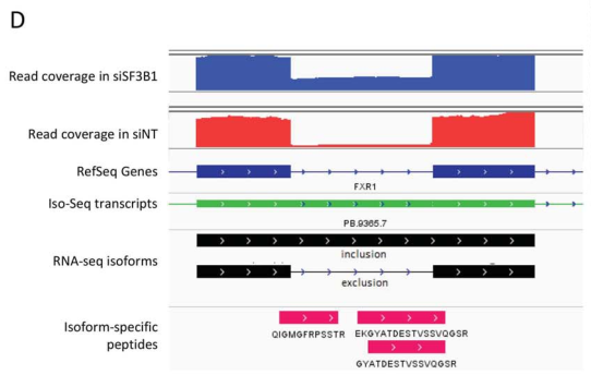 例如,全長(zhǎng)轉(zhuǎn)錄本進(jìn)行測(cè)序結(jié)果支持FXR1內(nèi)含子保留的三種肽段,因此這種內(nèi)含子保留事件也存在于注釋文件中。Illumina 測(cè)到的短 reads支持這一事件,并提供了定量的證據(jù),表明它在SF3B1的下調(diào)過(guò)程中比其對(duì)照組(圖6D)更高表達(dá)。