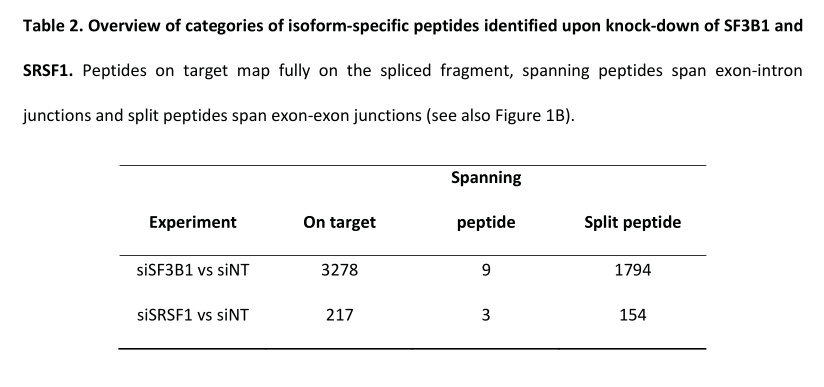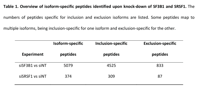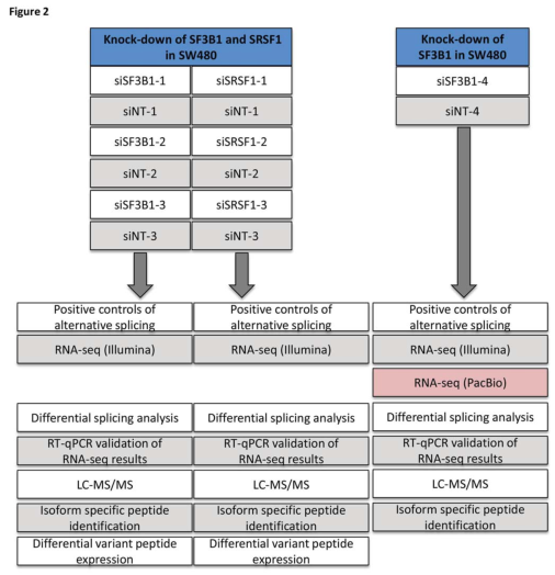 為了測(cè)試splicify這種蛋白組學(xué)數(shù)據(jù)的分析方法,建立了一種可以對(duì)isoform變化進(jìn)行調(diào)控的實(shí)驗(yàn)?zāi)P?,?duì)SW480結(jié)腸癌細(xì)胞系中的剪接因子SF3B1和SRSF1進(jìn)行siRNA干擾以下調(diào)其表達(dá),然后通過(guò)RNA-seq和質(zhì)譜進(jìn)行結(jié)果檢測(cè)。