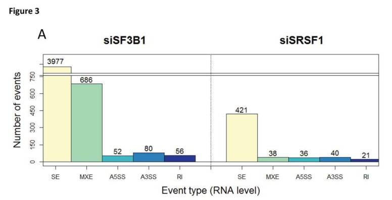 轉(zhuǎn)錄組分析顯示siSF3B1和siSRSF1的可變剪接事件與對(duì)照組相比有顯著差異(圖3A),證明對(duì)剪接因子的操作導(dǎo)致了差異剪接的產(chǎn)生。