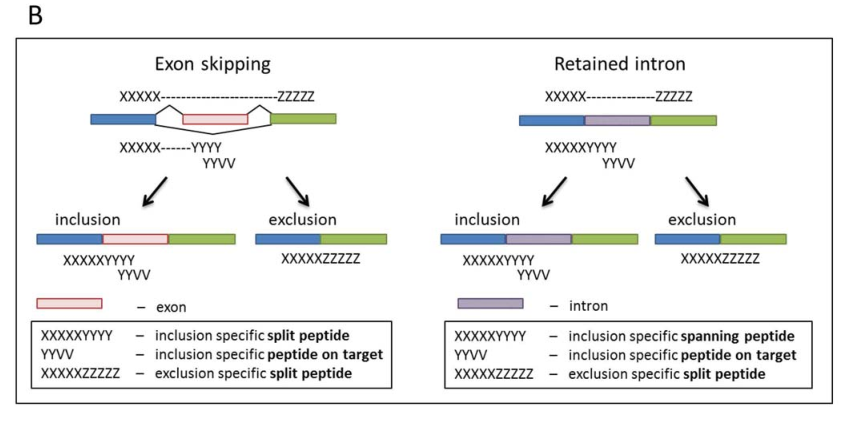 在RNA水平上確定的所有重要剪接事件,包括inclusion 和exclusion變異,都被用于質(zhì)譜鑒定的數(shù)據(jù)庫(kù)構(gòu)建(圖1A)。為了證明這些剪接事件被翻譯成蛋白質(zhì),作者搜索了isoform特異的肽段庫(kù)(圖1B)。