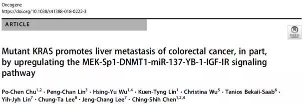 3月21日,Nature旗下癌癥雜志Oncogene在線發(fā)表了來自臺灣中央研究院生物化學(xué)研究所等機(jī)構(gòu)的一項研究成果。該研究發(fā)現(xiàn),KRAS基因突變通過上調(diào)MEK—Sp1K—DNMT1K—miR-137K—YB-1K—IGF-IR信號通路促進(jìn)結(jié)直腸癌的肝轉(zhuǎn)移。這為MEK抑制劑作為輔助藥物與標(biāo)準(zhǔn)治療藥物聯(lián)合使用,防止KRAS突變的CRC患者在接受肝臟切除手術(shù)之后復(fù)發(fā),提供了理論支持。