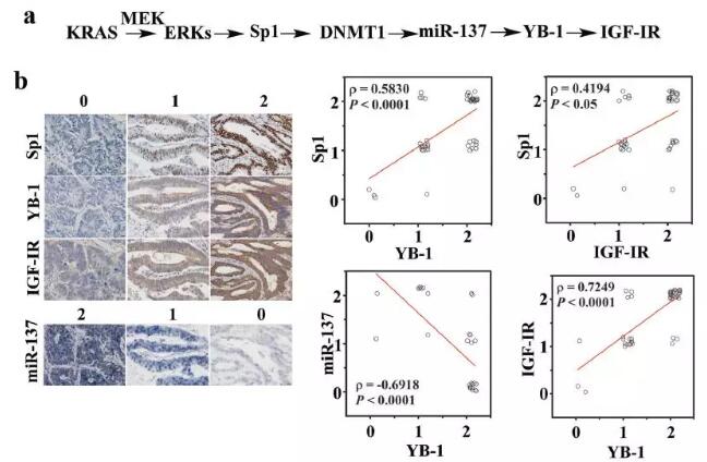 盡管我們都知道胰島素樣生長因子I受體(IGF-IR)能夠促進(jìn)結(jié)直腸癌的肝轉(zhuǎn)移,但是并不清楚腫瘤是通過哪種機(jī)制上調(diào)IGF-IR表達(dá)。研究發(fā)現(xiàn)在結(jié)直腸癌細(xì)胞中,KRAS突變體通過MEK—Sp1—DNMT1—miR-137信號通路上調(diào)Y-box結(jié)合蛋白1 (YB-1),進(jìn)而轉(zhuǎn)錄激活I(lǐng)GF-IR基因表達(dá)。后續(xù)46例KRAS突變的CRC患者肝轉(zhuǎn)移免疫組織化學(xué)評估試驗也進(jìn)一步證實這一發(fā)現(xiàn),Sp1、 miR-137、YB-1和IGF-1R之間的表達(dá)顯著相關(guān)。在動物模型中,通過基因敲減或MEK藥物抑制下調(diào)YB-1和IGF-IR的表達(dá),可阻止KRAS突變的結(jié)直腸癌肝轉(zhuǎn)移。