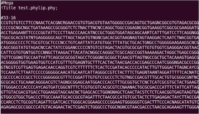 VCF轉(zhuǎn)MEGA格式。用TASSEL打開VCF文件,另存為Phylip格式(Save As — ?Phylip(Interleaved)),如圖3,然后用MEGA7把Phylip文件轉(zhuǎn)換成MEGA格式(File — Convert File Format to MEGA — 選擇剛才轉(zhuǎn)出的Phylip文件按提示操作存成.meg文件),轉(zhuǎn)出的格式如圖4,前兩行為文件頭信息,無(wú)實(shí)際意義,但是必有。“#33-16”表示樣本編號(hào),與fasta文件的格式不同,mega格式樣本的起始不是“>”而是“#”,接下來(lái)便是該樣本的SNP連接成的序列信息。