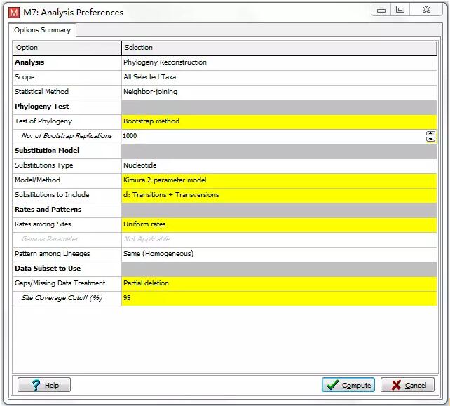 參數(shù)設(shè)置,主要填寫B(tài)ootstrap值,一般選擇500或1000次;Model一般用Kimura 2-parameter Model(K2),如果K2模型運(yùn)行不了,可以換成p-distance模型;Gaps/Missing Data Treatment選擇Partial deletion或者pairwise deletion,選擇complete deletion時(shí)帶有缺失值的標(biāo)記都會(huì)被刪除,所以必須謹(jǐn)慎;Site Coverage Cutoff與我們常說(shuō)的完整度相同,一般填寫成我們過(guò)濾標(biāo)記時(shí)使用的完整度,上述參數(shù)設(shè)置完成后,點(diǎn)擊compute即可。(見圖6)