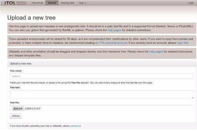 1、打開iTOL主頁(yè)以后,選擇上端的Upload選項(xiàng),出現(xiàn)輸入界面后,可以在Tree text框中粘貼nwk中的內(nèi)容,也可以通過(guò)【選擇文件】選項(xiàng)選擇需要展示的進(jìn)化樹,之后點(diǎn)擊Upload即可。