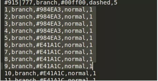 2、進(jìn)化樹著色,按照iTOL的要求,填寫一個(gè)顏色配置文件,填寫方法如該鏈接的說(shuō)明https://itol.embl.de/help/colors_styles_template.txt,給末端分枝著色的配置文件填寫如下圖,[2,branch,#984EA3,normal,1]中2為樣本ID,branch表示給樹枝上色,#984EA3為16進(jìn)制顏色代碼,normal表示線條的樣式為正常的實(shí)線,1表示枝條的大小為1,該文件必須以.txt結(jié)尾,填寫完成后,將其拖入進(jìn)化樹的界面即可。