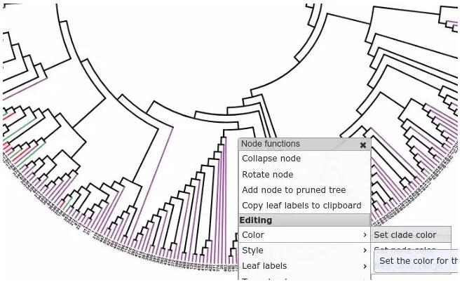 4、分枝顏色的統(tǒng)一。上面的著色例子只對(duì)末端分枝進(jìn)行了著色,有時(shí)候,我們需要對(duì)某個(gè)分枝的樣本進(jìn)行顏色的統(tǒng)一,可以選中該分枝并點(diǎn)擊鼠標(biāo),在彈出的下拉框中選擇color — set clade color — 選擇想用的顏色或填入對(duì)應(yīng)的顏色代碼即可。