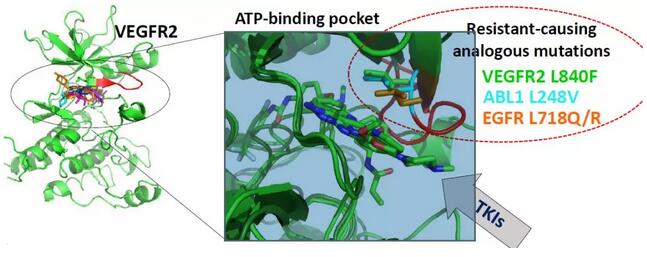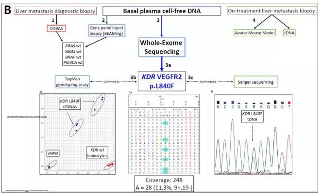 西班牙國家癌癥研究中心(CNIO)胃腸癌臨床研究組的學(xué)者們,納入一例RAS / BRAF / PIK3CA未發(fā)生突變且對抗VEGF抑制劑具有抗性的轉(zhuǎn)移性結(jié)腸直腸癌患者,收集其血漿提取cfDNA,分離白細(xì)胞提取gDNA以及轉(zhuǎn)移組織提取tDNA,進(jìn)行全外顯子組測序,發(fā)現(xiàn)WES-cfDNA與腫瘤外顯子組測序結(jié)果一致率為77%,且能夠鑒別KDR / VEGFR2 L840F克隆,該體細(xì)胞突變是患者難治性的原因。其他腫瘤數(shù)據(jù)庫如TCGA等KDR體細(xì)胞突變的樣本比例在1-3%,且位于其他癌癥相關(guān)激酶(如EGFR,ABL1和ALK)中經(jīng)常突變的蛋白質(zhì)殘基中。此外,作者還進(jìn)行了一系列功能實驗,包括不同細(xì)胞系VEGFR2突變體異位表達(dá)、激酶和藥物敏感性測定以及細(xì)胞和患者衍生的異種移植瘤實驗。結(jié)果表明,L840F對抗血管生成藥物產(chǎn)生強(qiáng)烈的抗性,而KDR熱點突變體R1032Q賦予對強(qiáng)VEGFR2抑制劑的敏感性。小鼠移植瘤實驗表明VEGFR2突變體D717V,G800D,G800R,L840F,G843D,S925F,R1022Q,R1032Q和S1100F 促進(jìn)小鼠腫瘤生長。
