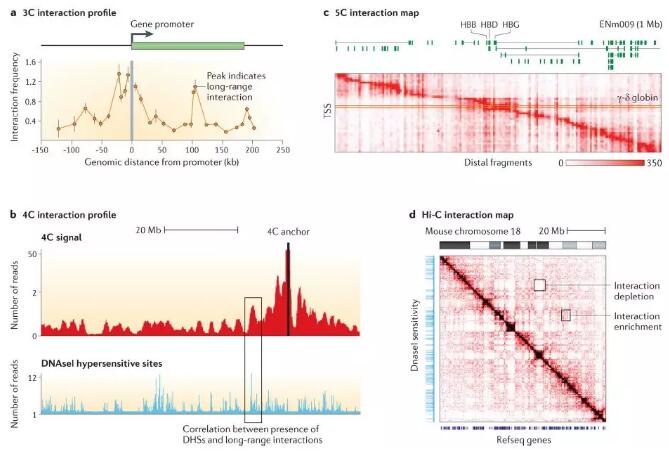基于3C及衍生技術(shù),克服了成像技術(shù)的缺點(diǎn),能夠以足夠的分辨率在全基因組范圍內(nèi)研究染色體折疊,以及涉及的基因和調(diào)控元件。詳細(xì)介紹見(jiàn)上述實(shí)驗(yàn)技術(shù)——染色質(zhì)構(gòu)象捕獲及其衍生技術(shù)。