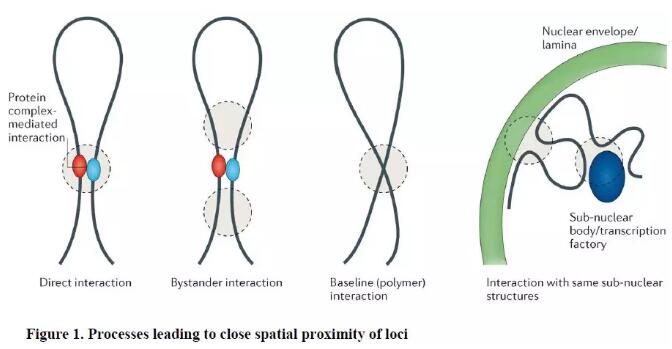 這些3C及其衍生技術(shù)報(bào)告了細(xì)胞群體中兩個(gè)基因座空間上緊密接近的頻率,但未區(qū)分功能性與非功能性的位點(diǎn)間關(guān)聯(lián),也未揭示導(dǎo)致其共定位的機(jī)制??臻g上緊密接近包括以下幾種情況:1)Direct interaction:兩個(gè)基因座之間直接、特異性接觸的結(jié)果(由結(jié)合它們的蛋白質(zhì)復(fù)合物介導(dǎo));2)Interaction with the same sub-nuclear structures:成對(duì)基因座與相同亞核結(jié)構(gòu)間接共定位的結(jié)果(例如核纖層,核仁、或轉(zhuǎn)錄工廠等)。3)Bystander interaction:在某些細(xì)胞中,由于鄰近的某些遠(yuǎn)程互作或其他約束因素決定的染色質(zhì)纖維的堆積和折疊的造成的非特異性接觸,或者由于擁擠核中的隨機(jī)(非特異性)碰撞導(dǎo)致的非特異性接觸。4)Baseline(polymer) interaction:染色質(zhì)纖維非常長(zhǎng),而且柔韌,染色體具有聚合體性質(zhì),因此,即使在沒(méi)有任何特定高階結(jié)構(gòu)的情況下,這個(gè)特征在很大程度上也決定了基因座間相互作用的頻率。