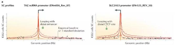 此外,研究發(fā)現(xiàn)啟動(dòng)子周?chē)某森h(huán)互作模式不對(duì)稱(chēng):?jiǎn)?dòng)子可與位于轉(zhuǎn)錄起始位點(diǎn)上游或下游的遠(yuǎn)端元件互作,但成環(huán)互作常見(jiàn)于上游?120Kb。不對(duì)稱(chēng)原因尚不清楚,但是可能暗示某種方向性。從這些研究可以看出,染色體是由遠(yuǎn)距離互作驅(qū)動(dòng)的高度復(fù)雜的三維網(wǎng)絡(luò)。同時(shí)提出了新的問(wèn)題:介導(dǎo)它們的蛋白質(zhì)以及這些成環(huán)互作如何促進(jìn)基因調(diào)控。
