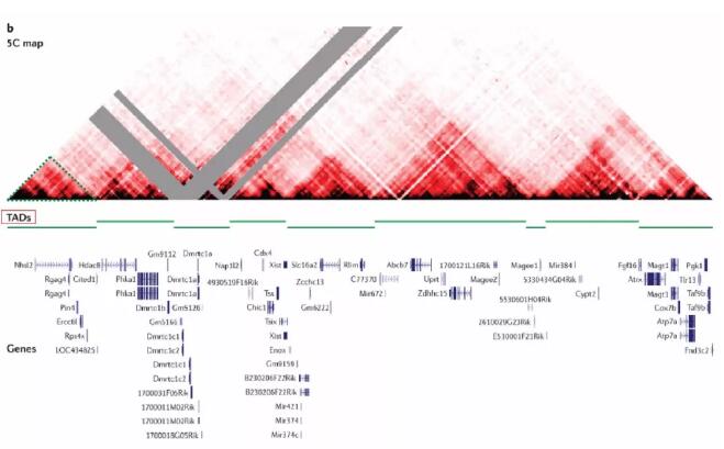 包含小鼠X染色體失活中心的4.5Mb區(qū)域的高分辨率5C互作圖揭示了一系列大的結(jié)構(gòu)域。位于這些TADs內(nèi)的基因座往往頻繁地相互作用,但它們與位于其領(lǐng)域之外的基因座的相互作用要少得多,即TAD內(nèi)部的相互作用強(qiáng),不同TAD間的相互作用弱。這種特征使研究人員能夠通過(guò)分析分辨率較低的全基因組Hi-C互作圖與隱馬爾可夫模型方法結(jié)合,來(lái)識(shí)別整個(gè)人類(lèi)和小鼠基因組中的TAD。TADs是染色體的通用結(jié)構(gòu)模塊,人類(lèi)和小鼠的基因組都由2000多個(gè)TAD組成,覆蓋了90%以上的基因組。
