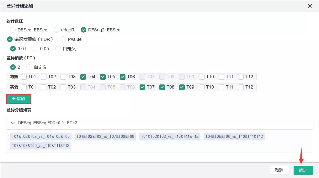 登錄百邁客云(www.biocloud.net)——我的項(xiàng)目——進(jìn)入相應(yīng)項(xiàng)目【報(bào)告】——差異基因挖掘——差異表達(dá)基因集查詢——添加差異分組、自定義軟件、自定義參數(shù)(FDR(或者p-value)、FC、添加對照組及實(shí)驗(yàn)組)——【添加】——【確定】。