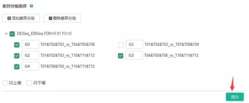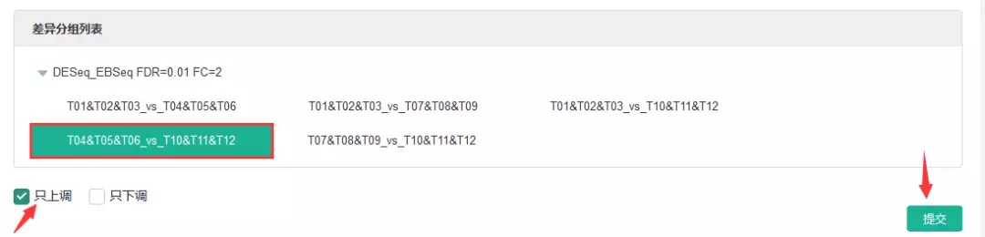 登錄百邁客云(www.biocloud.net)——進(jìn)入相應(yīng)項(xiàng)目【報(bào)告】——差異基因挖掘—差異表達(dá)基因集查詢——點(diǎn)擊相應(yīng)差異分組并選擇“只上調(diào)/只下調(diào)”,最后點(diǎn)擊“提交”。