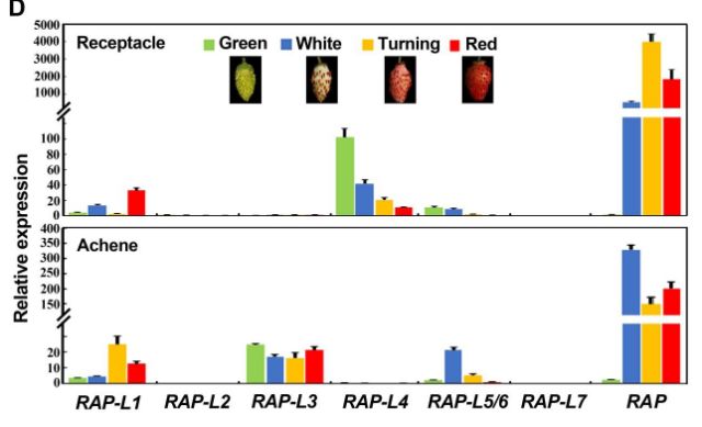 RAP 編碼谷胱甘肽S-轉(zhuǎn)移酶(GST),F(xiàn). vesca中有的7個GST同源基因,它們被命名為RAP-L1到RAP-L7,qRT-PCR表達量分析表明,RAP主要在果實中表達較高。為了探索它們對果實著色的貢獻,分別在果實成熟的過程的4個發(fā)育階段檢測RAP與其它同源基因的表達趨勢,RAP-L4在綠色階段是表達最豐富,RAP從著色階段開始表達,且表達量較高(圖3)。