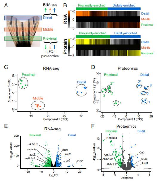 ????????為了鑒定可能參與尾鰭位置記憶的候選分子,本研究對(duì)未受傷的斑馬魚尾鰭的近端,中間和遠(yuǎn)端區(qū)域進(jìn)行了RNA測(cè)序(RNA-seq)和無(wú)標(biāo)記定量(LFQ)蛋白質(zhì)組學(xué)(圖1A),共鑒定出566個(gè)轉(zhuǎn)錄本和238個(gè)蛋白質(zhì),主要存在于近或遠(yuǎn)的富集梯度中(圖1B)。另外,主成分分析(PCA)顯示鰭的近端和遠(yuǎn)端區(qū)域之間的轉(zhuǎn)錄物(圖1C)和蛋白質(zhì)(圖1D)豐度的變化很大。中間區(qū)域的轉(zhuǎn)錄本聚集成一個(gè)獨(dú)特的組,但更接近于遠(yuǎn)端區(qū)域(圖1C)。差異豐富分子的最大差異發(fā)生在近端和遠(yuǎn)端區(qū)域之間,包括1,424個(gè)轉(zhuǎn)錄本和113個(gè)蛋白質(zhì)(圖1E)。因此,基因組的表達(dá)在整個(gè)尾鰭的近遠(yuǎn)端軸上存在著定量的差異。