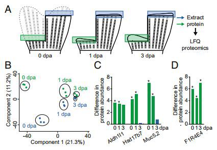 為了檢驗(yàn)這種預(yù)測(cè),分別于截肢后1、3天(dpa),在blastema形成期和生長(zhǎng)期(圖4A)對(duì)再生鰭的片段進(jìn)行LFQ蛋白質(zhì)組學(xué)研究。為了減少魚類之間的潛在變異,作者從同一條魚中采集了再生鰭的背側(cè)和腹遠(yuǎn)端區(qū)域(雙截肢)。作者發(fā)現(xiàn)3061種蛋白質(zhì)中有97種、11種和2種在0,1和3dpa的背側(cè)和腹側(cè)-遠(yuǎn)側(cè)位置之間差異表達(dá)。在再生過(guò)程中不同時(shí)間蛋白質(zhì)表達(dá)的PCA顯示1和3dpa的樣品聚集成不同的組,在近端或遠(yuǎn)端區(qū)域之間幾乎沒(méi)有變化,而在未損傷的鰭(0dpa)中近端和遠(yuǎn)端區(qū)域之間存在更多變異(圖4B)。然而,在1dpa差異表達(dá)的11種蛋白中,6種在未受損魚鰭(0dpa)中也差異表達(dá)。編碼這些蛋白質(zhì)的三個(gè)基因aldh1l1,hsd17b7和muc5.2(圖4C)也通過(guò)RNA-seq測(cè)量發(fā)現(xiàn)在未受傷的鰭片中差異表達(dá)。UniProt ID F1R4E4的一種無(wú)特征蛋白質(zhì),是唯一在0,1和3dpa差異表達(dá)的蛋白質(zhì)(圖4D)。