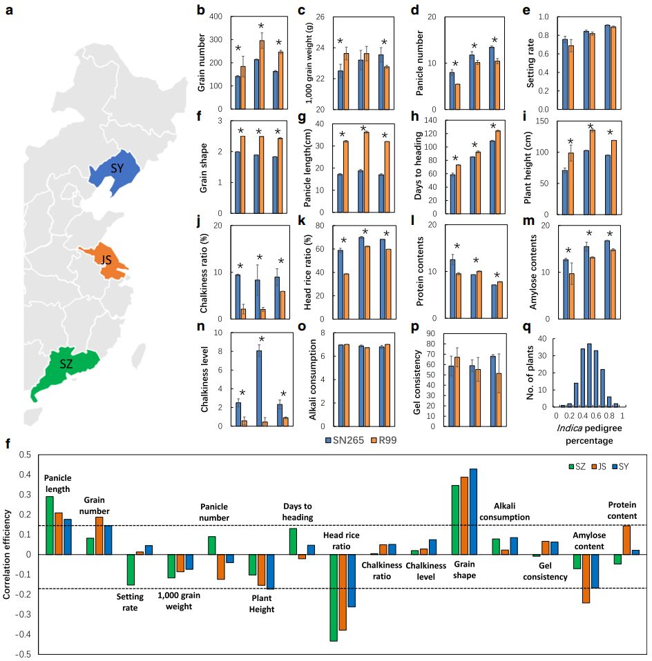 秈稻和粳稻為亞洲栽培水稻的兩個亞種,它們的地理分布以及形態(tài)學(xué)性狀差異明顯,揭示其農(nóng)藝性狀背后的遺傳基礎(chǔ)對于水稻生產(chǎn)非常重要,然而,其遺傳背景、生態(tài)條件以及農(nóng)藝性狀之間的關(guān)系尚不清楚。沈農(nóng)265(SN265)是我國第一個商用的超級稻,它作為中國北方骨干親本引領(lǐng)著育種方向。本研究利用二代和三代測序?qū)Ρ狈骄统壍維N265和R99進行測序,并獲取SN265高質(zhì)量基因組,又構(gòu)建了RIL群體重測序遺傳連鎖圖譜,并對多個重要農(nóng)藝性狀進行了QTL分析。此外,還發(fā)現(xiàn)若干基因功能隨生態(tài)環(huán)境的變化而改變,并且許多等位基因?qū)Σ煌倪z傳背景呈現(xiàn)差異性的響應(yīng)。